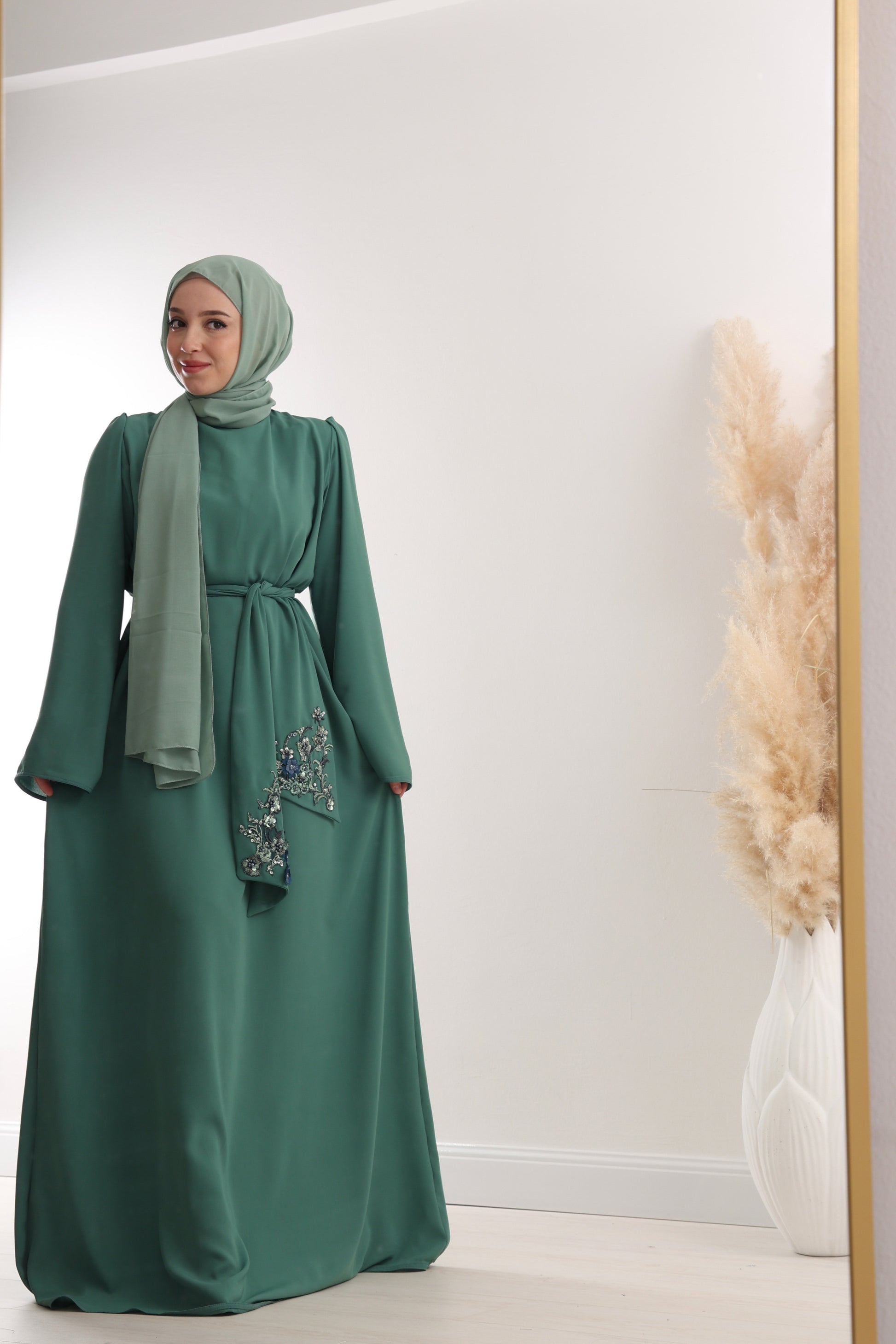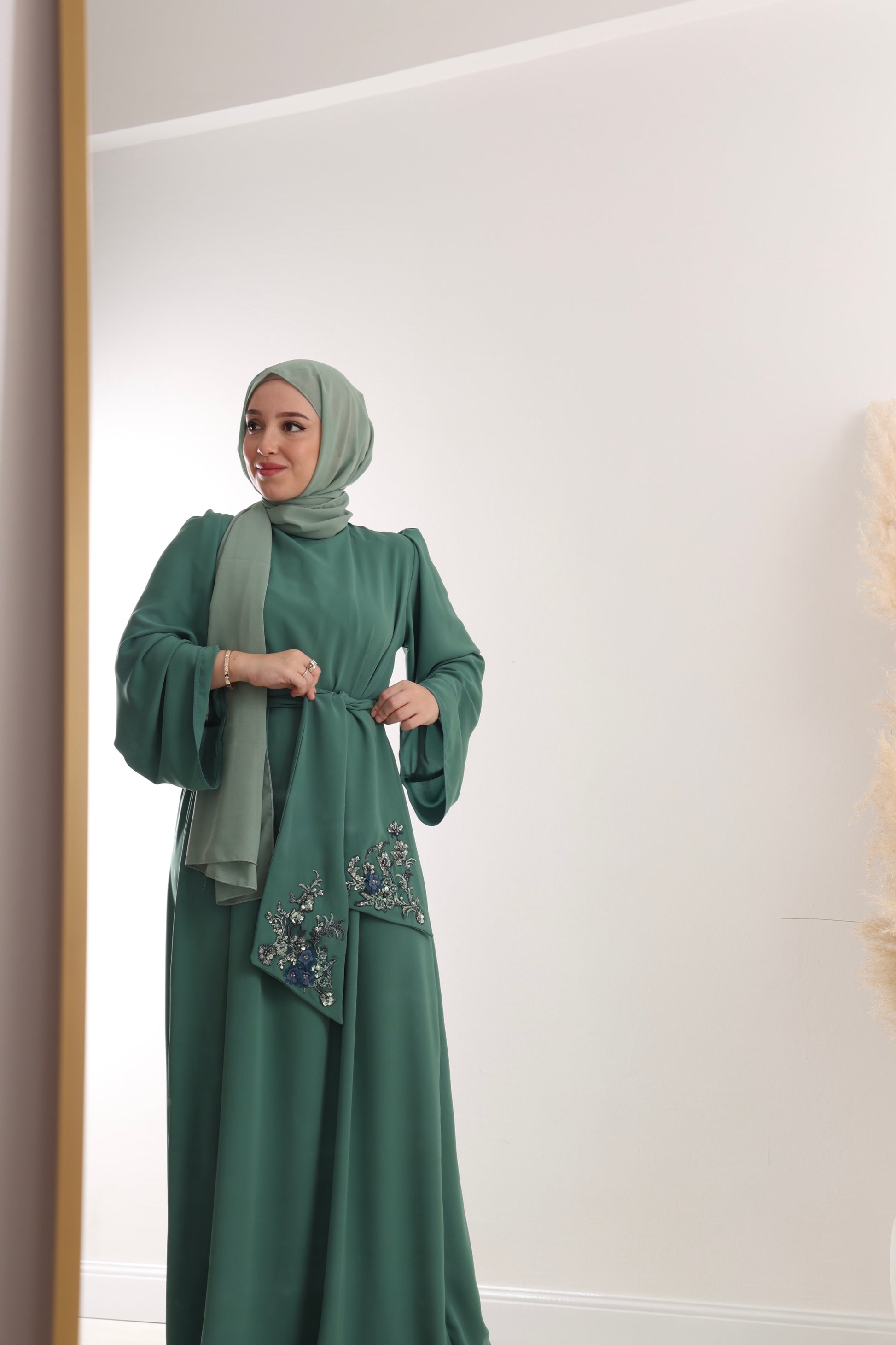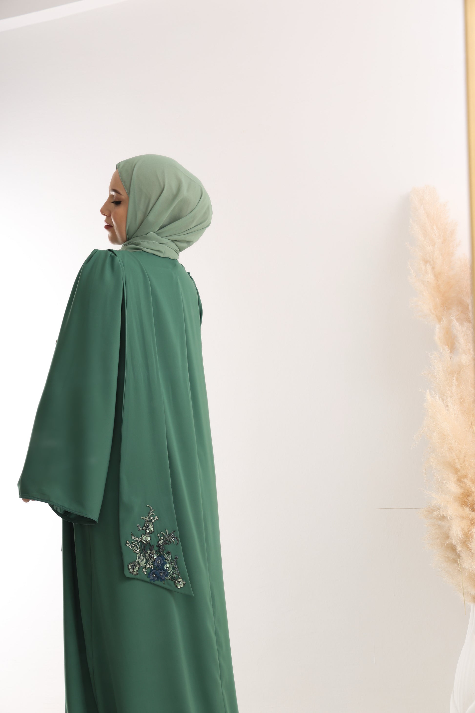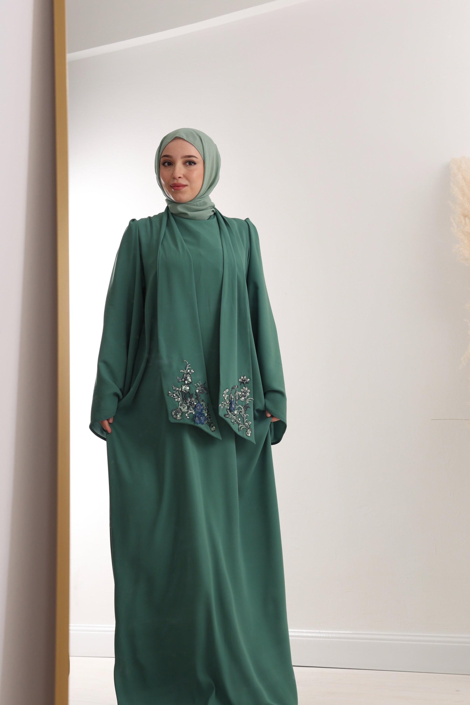 Zakoračite u eleganciju uz ovu smaragdno zelenu haljinu izrađenu od vrhunske Medina svile, koja pruža lagan i luksuzan osjećaj na koži. Dizajn je upotpunjen delikatnom cvijetnom čipkom pri dnu, ukrašenim perlicama u nijansama plave i srebrne, koje daju suptilan sjaj i sofisticiranost.