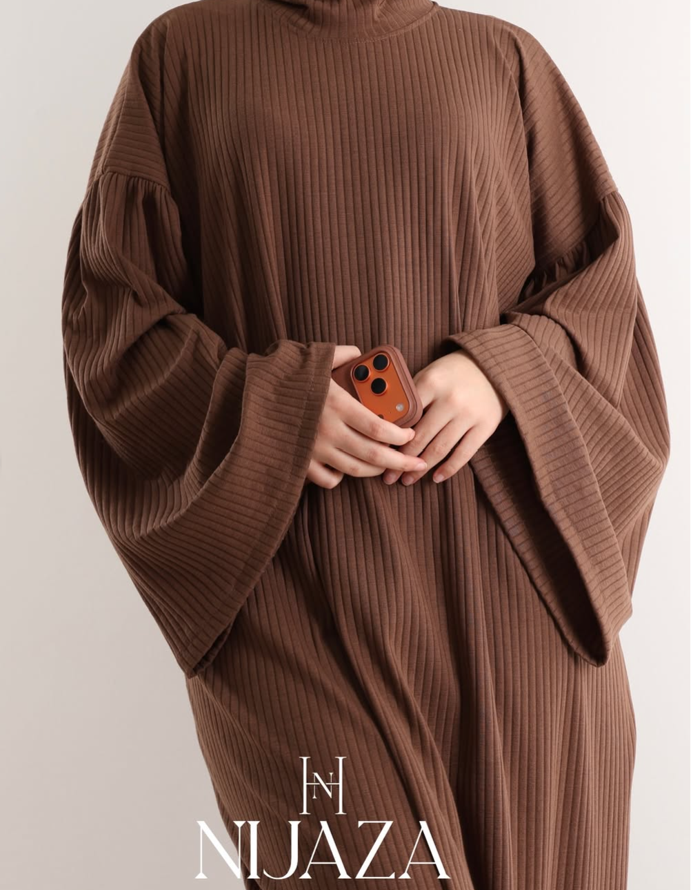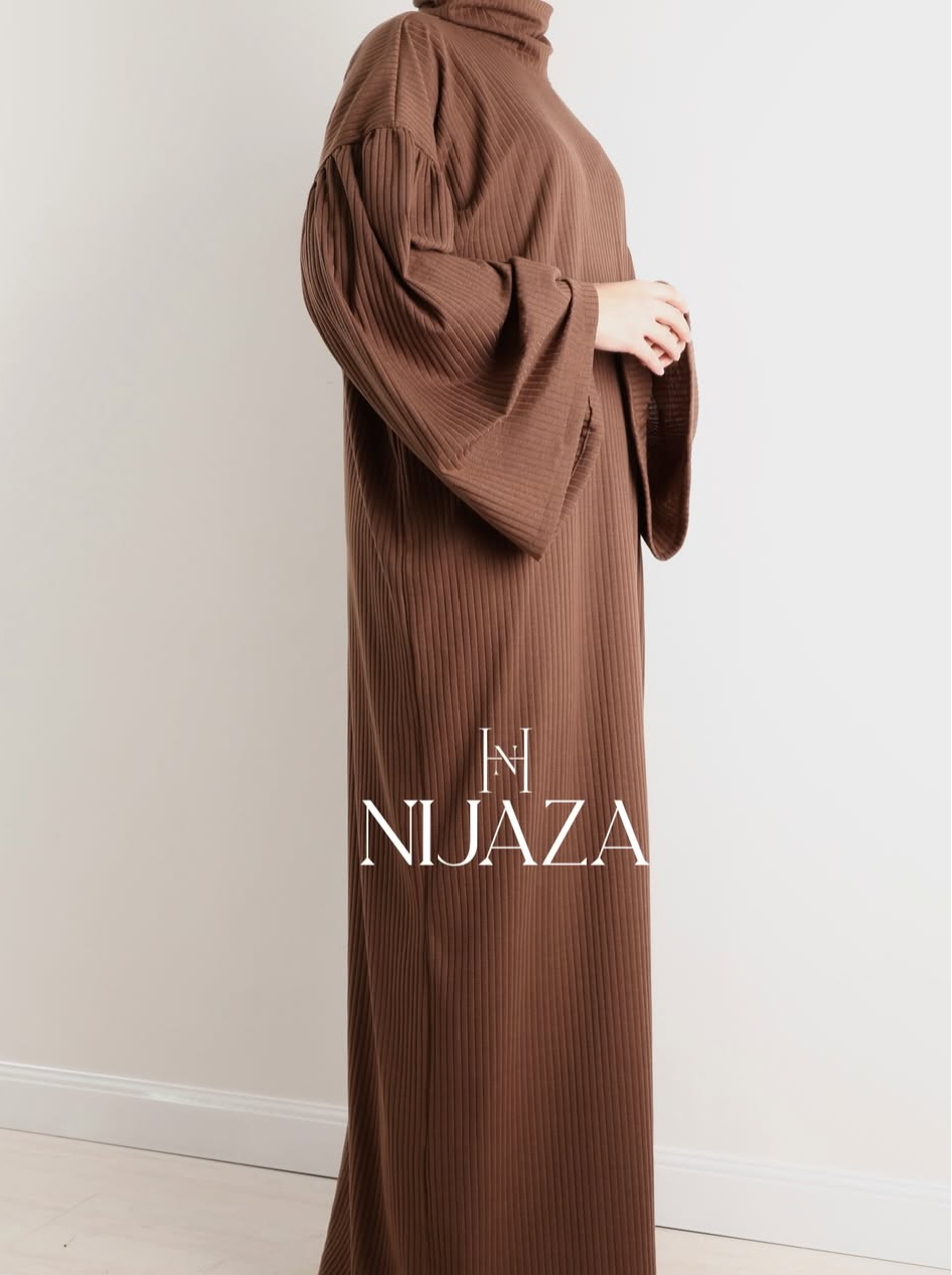 Elegantna i bezvremenska duga haljina izrađena od tople pletenine koji lijepo pada i prati liniju tijela bez naglašavanja. Dizajnirana s visokim ovratnikom i širokim, lepršavim rukavima koji daju sofisticiran i moderan izgled.