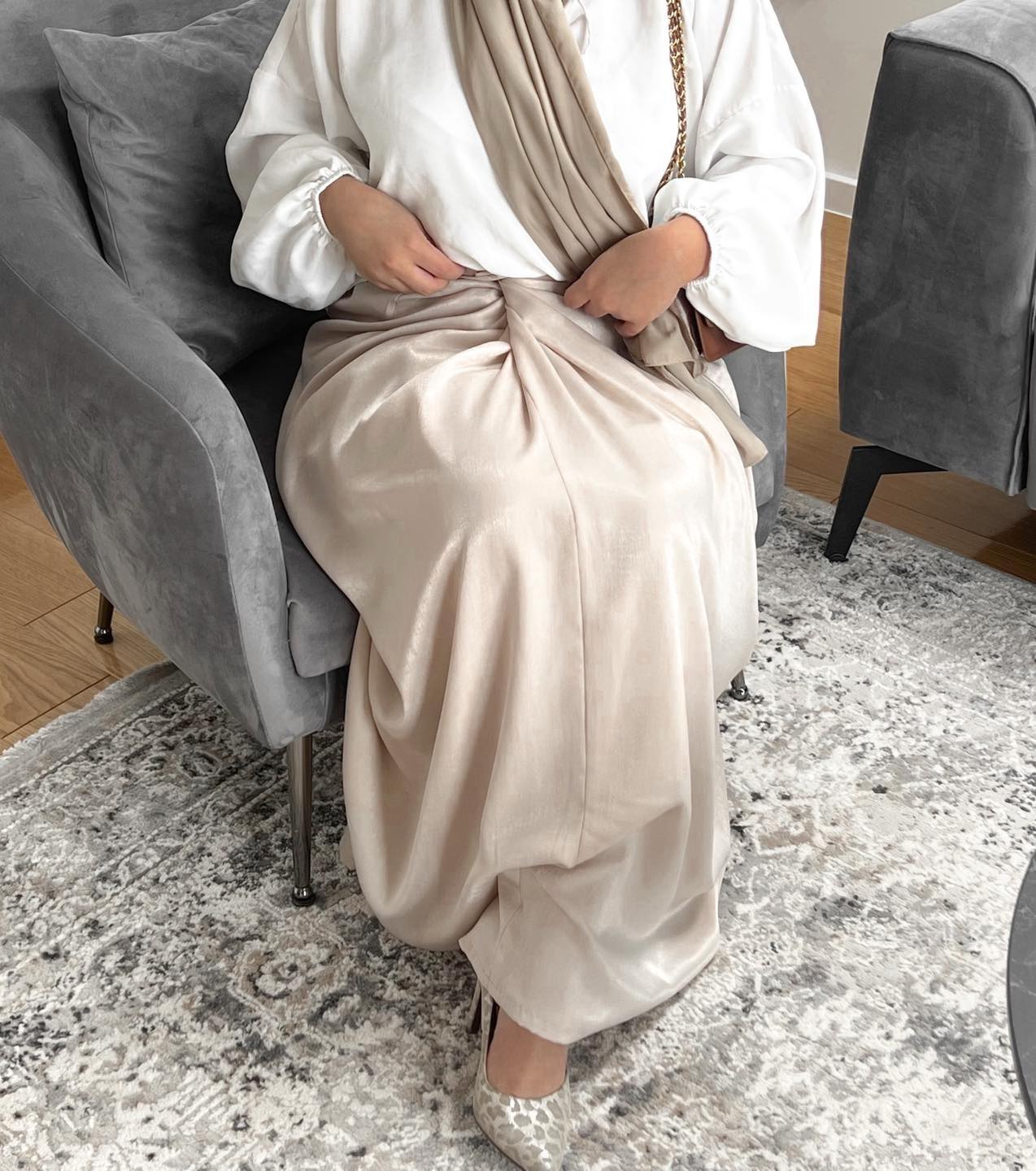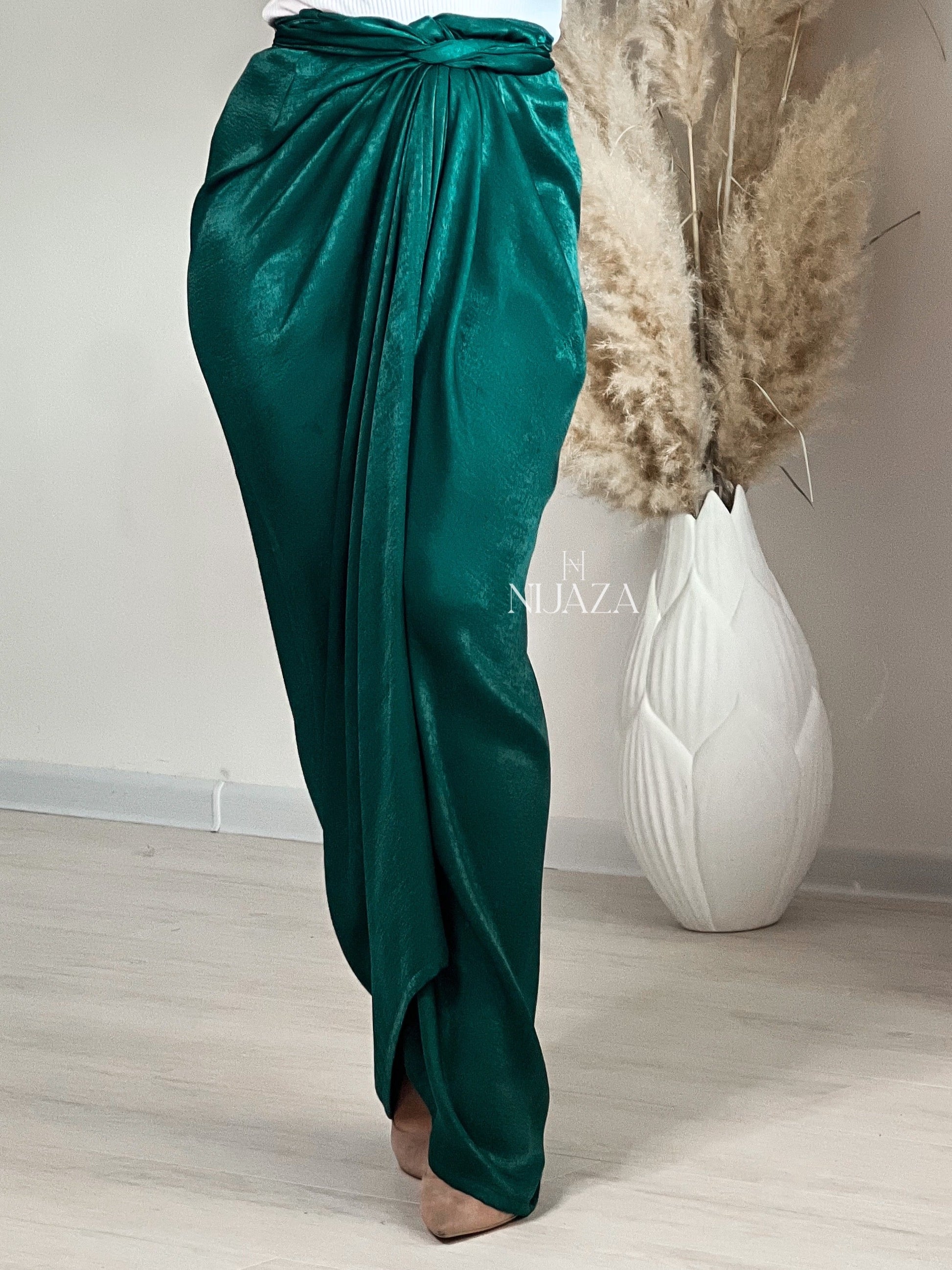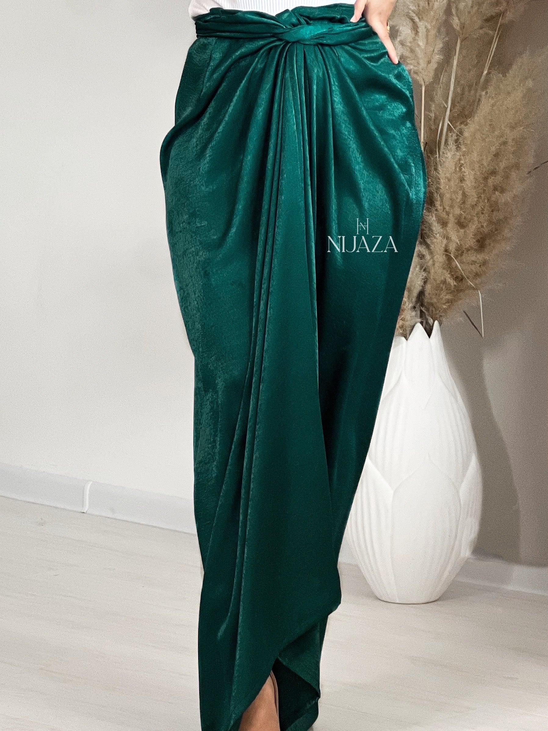 Elegantna pareo suknja na preklop, izrađena od luksuzne sjajne tkanine. Njena bogata nijansa i fluidan kroj čine je upečatljivim komadom za posebne prilike, ali i za sofisticirane svakodnevne kombinacije. S podesivim vezanjem u struku koje omogućava savršeno pristajanje, ova se suknja predivno kombinuje s bluzama, abajama ili efektnim topovima.